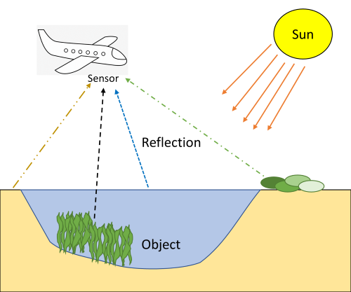There are two main types of data that we can work with (see IEP Technical Report 92 (PDF) for details). The first, is collected with areal photographs, and is known as ‘remote sensing’ (Figure 1). A specialized camera (sensor) is mounted on a platform (a drone, airplane, or satellite), and it can collect a regular-old photograph, or a hyperspectral photograph that records a lot of wavelengths of light that our eyes can’t see. Because different types of plants reflect different spectra of light (they are different colors) these photographs can be used to map location and extent of vegetation (Figure 2).