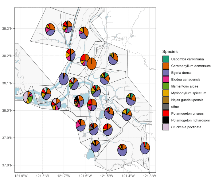 Our last post gave you an introduction to the water weeds of the Delta. Invasive submerged aquatic vegetation is taking over the waterways, making it difficult for boaters, fish, water project operations, and scientific researchers (Khanna et al. 2019). As we described in the blog “Getting into the weeds”, they are hard to control too. But how do we collect data on aquatic weeds and what do those data look like?