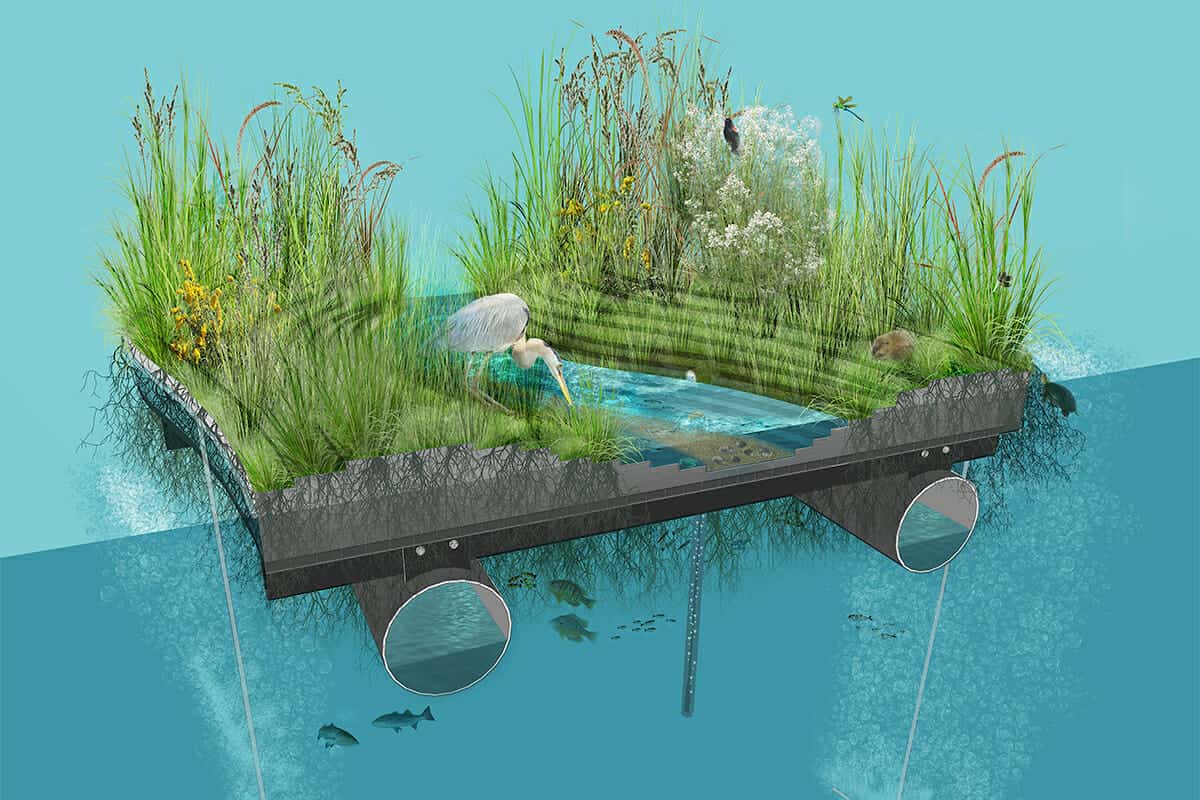 In August 2017, the National Aquarium launched a uniquely-engineered floating wetland prototype that functions like a natural wetland, providing important micro-habitats vital to many of the Chesapeake Bay’s estuarine organisms. Designed to rest at a predetermined elevation in the water column, the island supports a variety of habitat conditions above and below the water’s surface. A channel between wetland areas, equipped with airlifts to keep water cooled and moving, mimics a small tidal canal. Part of the wetland’s innovation is its aeration component, complete with four diffusers designed to mix the upper portion of the water column and limit the formation of harmful algal blooms.