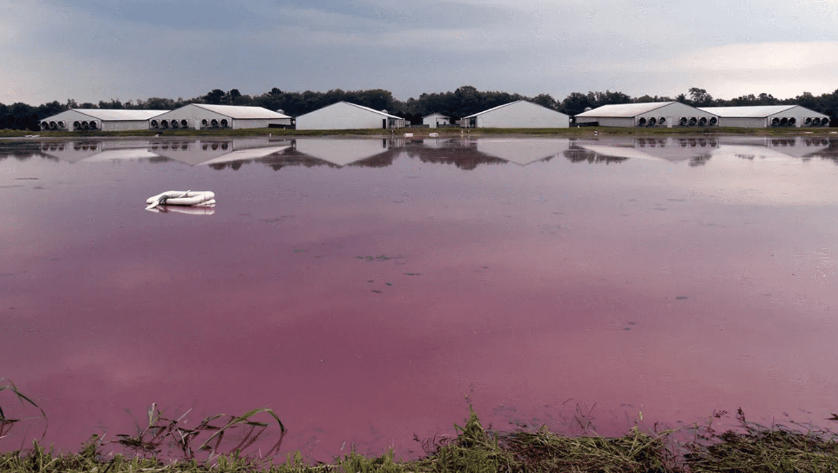 CAFOs often store animal waste in massive, open-air lagoons, like this one at Vanguard Farms in Chocowinity, North Carolina. Bacteria feeding on the animal waste turns the mixture a bright pink. picstever / Flickr / CC BY-ND 2.0