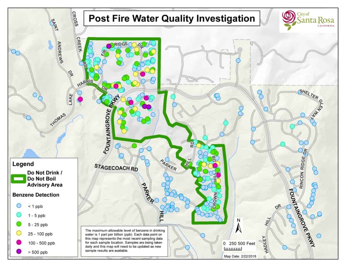 “This contamination is certainly attributable to the fire,” says Horenstein, “specifically the heating and burning of different plastic components in the system.” Initial sampling found benzene in the Fountaingrove water main, the local service components, and the lines that connected to destroyed properties.