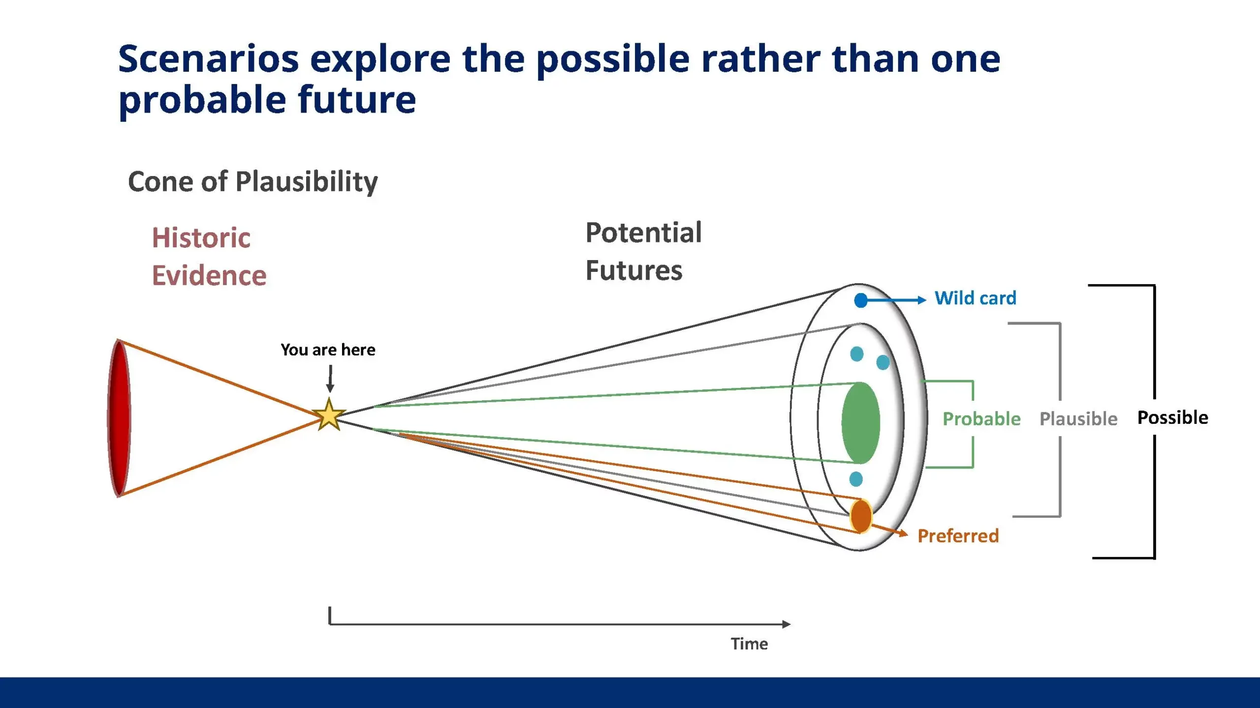 So what scenarios try to do under DMDU is to not just look at the most probable outcomes (our best guess of the future) represented by the green center but also consider a broader spectrum of plausible conditions to understand how the management strategies will perform.