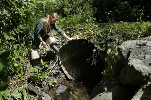 FILE – Melissa Erkel, a fish passage biologist with the Washington Department of Fish and Wildlife, looks at a culvert along the north fork of Newaukum Creek near Enumclaw, Wash., June 22, 2015. The Biden administration, on Wednesday, Aug. 16, 2023, was announcing nearly $200 million in federal infrastructure grants to upgrade tunnels that carry streams beneath roads but can be deadly to anadromous fish that get stuck trying to pass through. (AP Photo/Ted S. Warren, File)