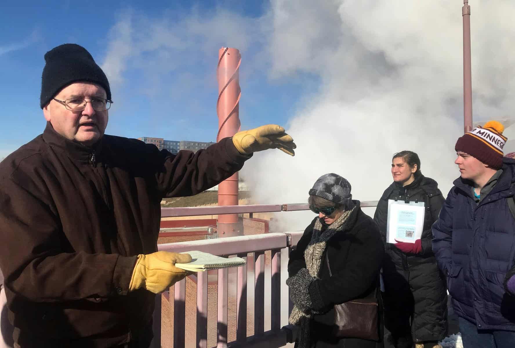 Steve Lee, a history buff and retired pollution regulator with the Minnesota Pollution Control Agency, stops near the University of Minnesota steam plant, southeast of St. Anthony Falls in Minneapolis. Lee led a historical tour along the Mississippi River in Minneapolis on Wednesday, Nov. 14, 2018, for students and others interested in the pollution history of the river. Elizabeth Dunbar | MPR News