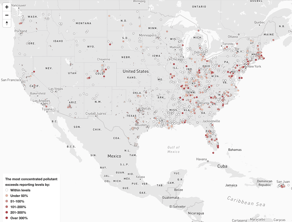 This map shows water systems included in the EPA’s records, as of Jan. 11. It’s based on boundaries developed by SimpleLab, a water-testing company. Click on a system to see the number of pollutants detected at or above the EPA’s minimum reporting levels and how much the most concentrated pollutant exceeded those levels. Points represent systems where the exact boundaries are not available. If you don’t see a map, click here.