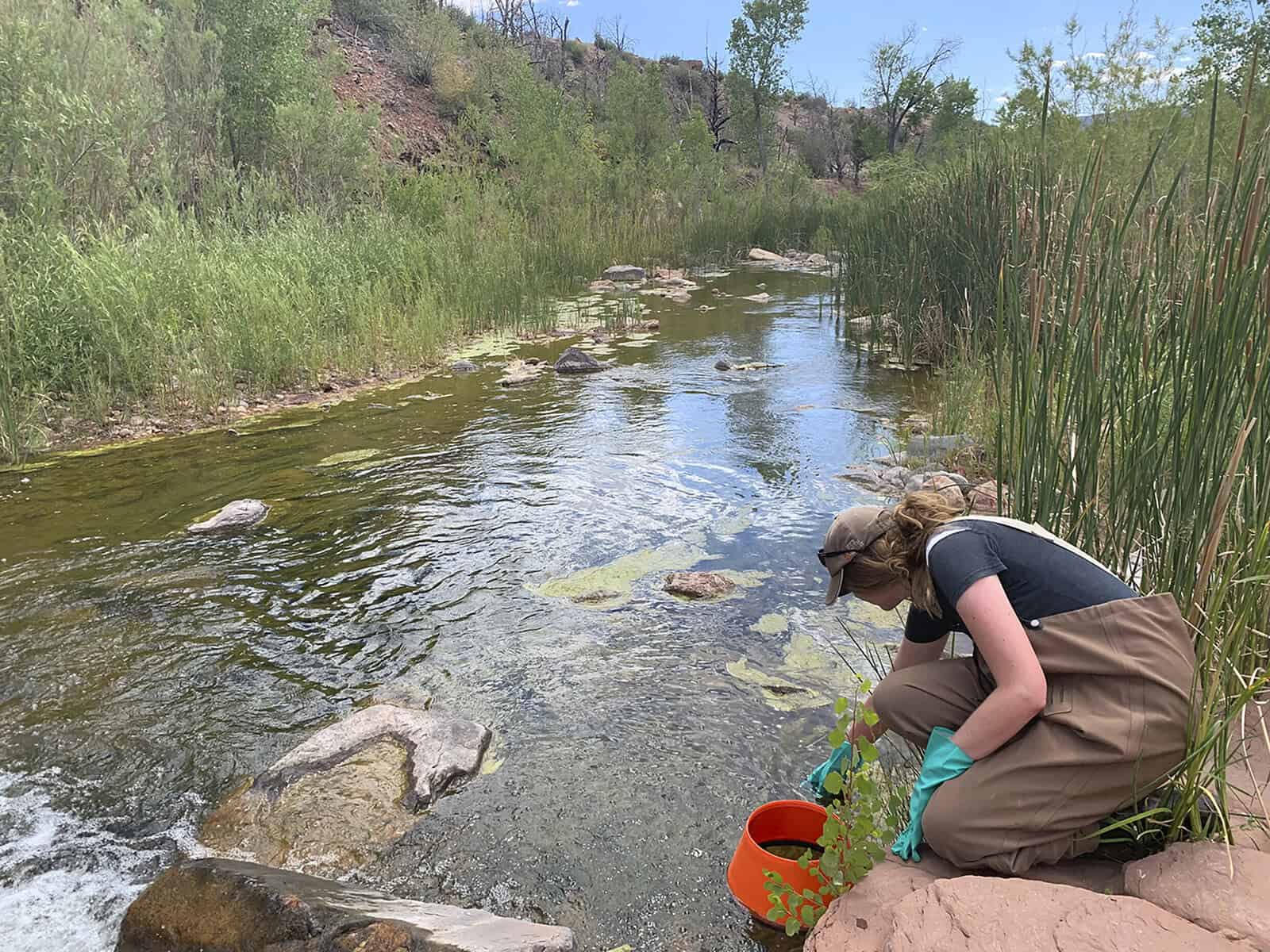 Researcher Hannah Bonner conducts a visual monitoring survey of benthic cyanobacteria in North Creek, a tributary of Utah’s Virgin River. Image credit: Emily Butko (photographer).
