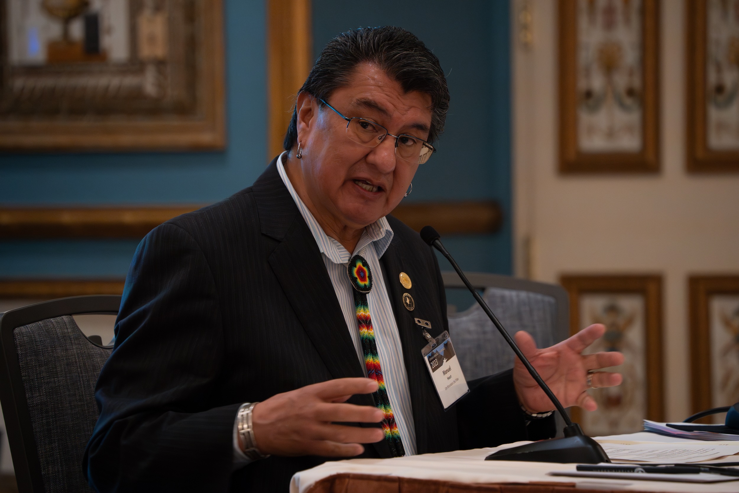 Photo: Manuel Heart, chairman of the Ute Mountain Ute Tribe, speaks about Colorado River water issues Dec. 13 at the Upper Colorado River Commission in Las Vegas. (Shannon Mullane, The Colorado Sun)