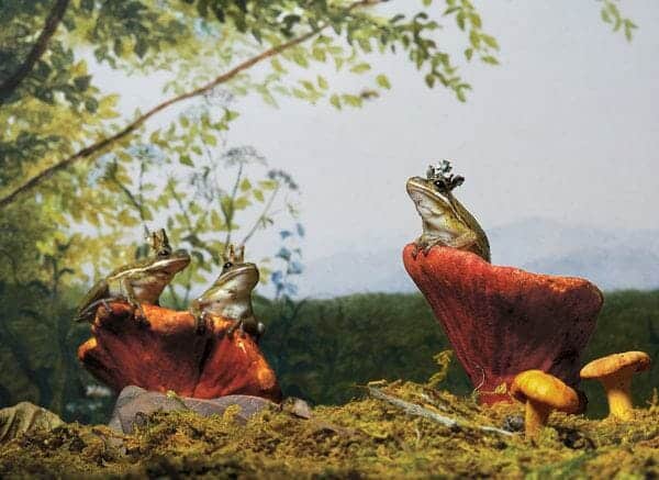 Banded bullfrogs, native to Southeast Asia (and not yet endangered), on their thrones of chanterelle, lobster and shiitake mushrooms. Photograph…