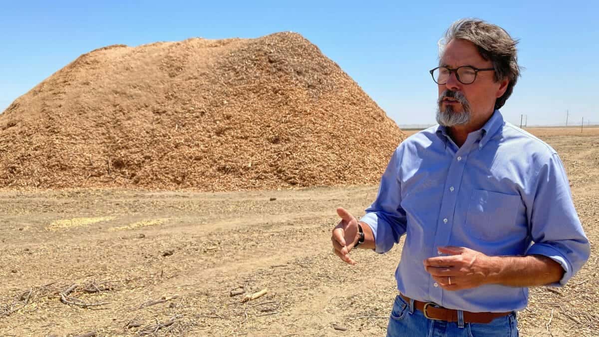Photo: Stuart Woolf stands near piles of almond tree wood chips that will get spread out on the his ranch.…