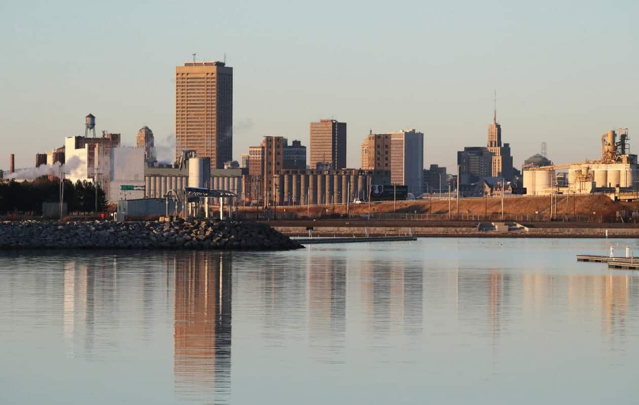 Downtown is reflected in the water at the small boat harbor on Friday. (Sharon Cantillon/Buffalo News) A Wales forest will…