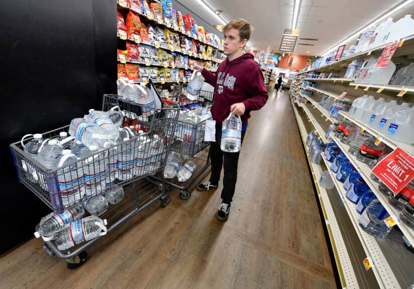 Brian Wright, 22, picks up bottled water out of a shopping cart while much of the bottled water has already…