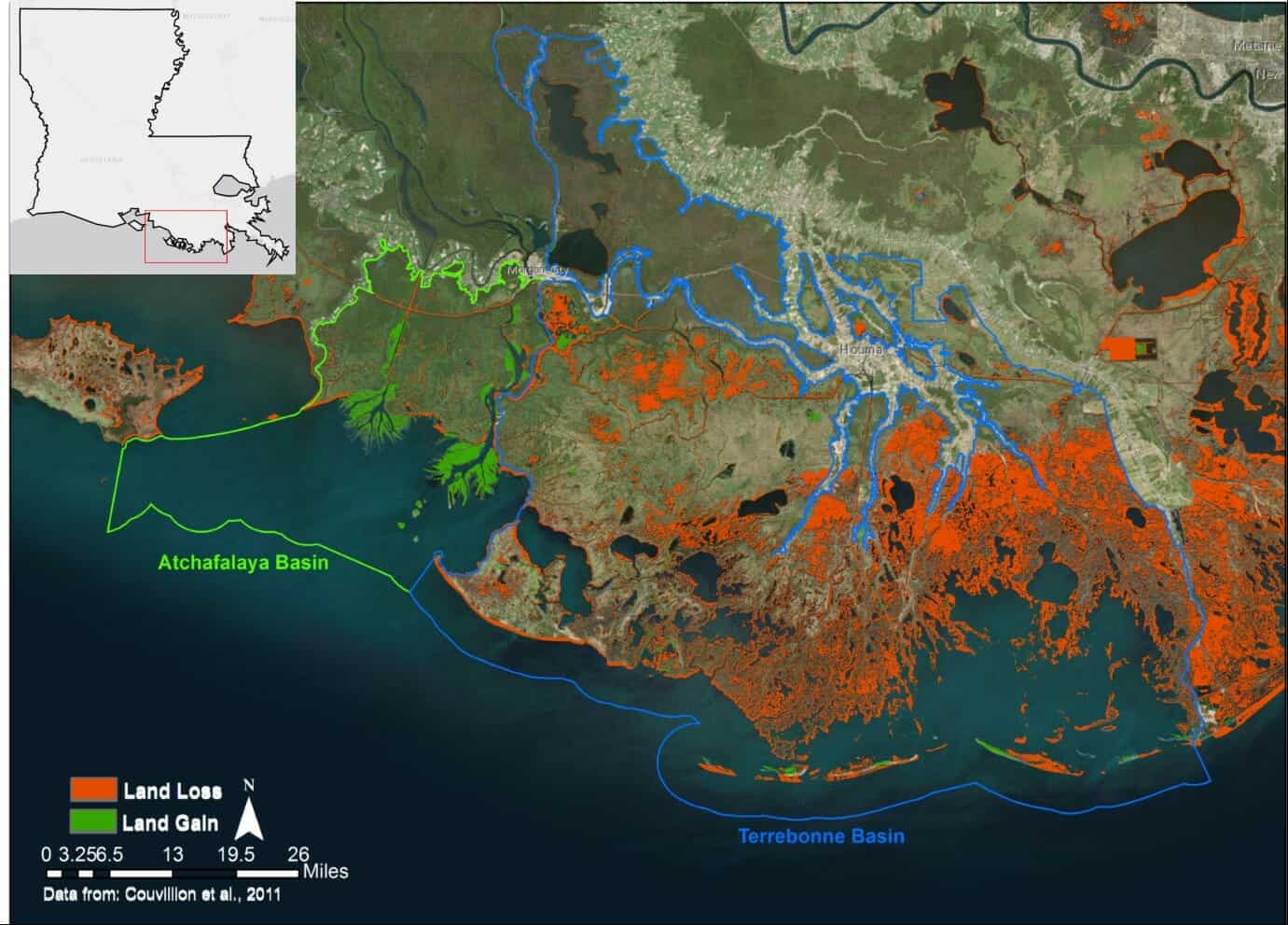 In the Atchafalaya Basin, lush, green fingers of land push out toward the Gulf of Mexico, building more and more acreage every year. In the Terrebonne Basin to the east, land is rapidly disappearing at one of the highest rates on the planet.