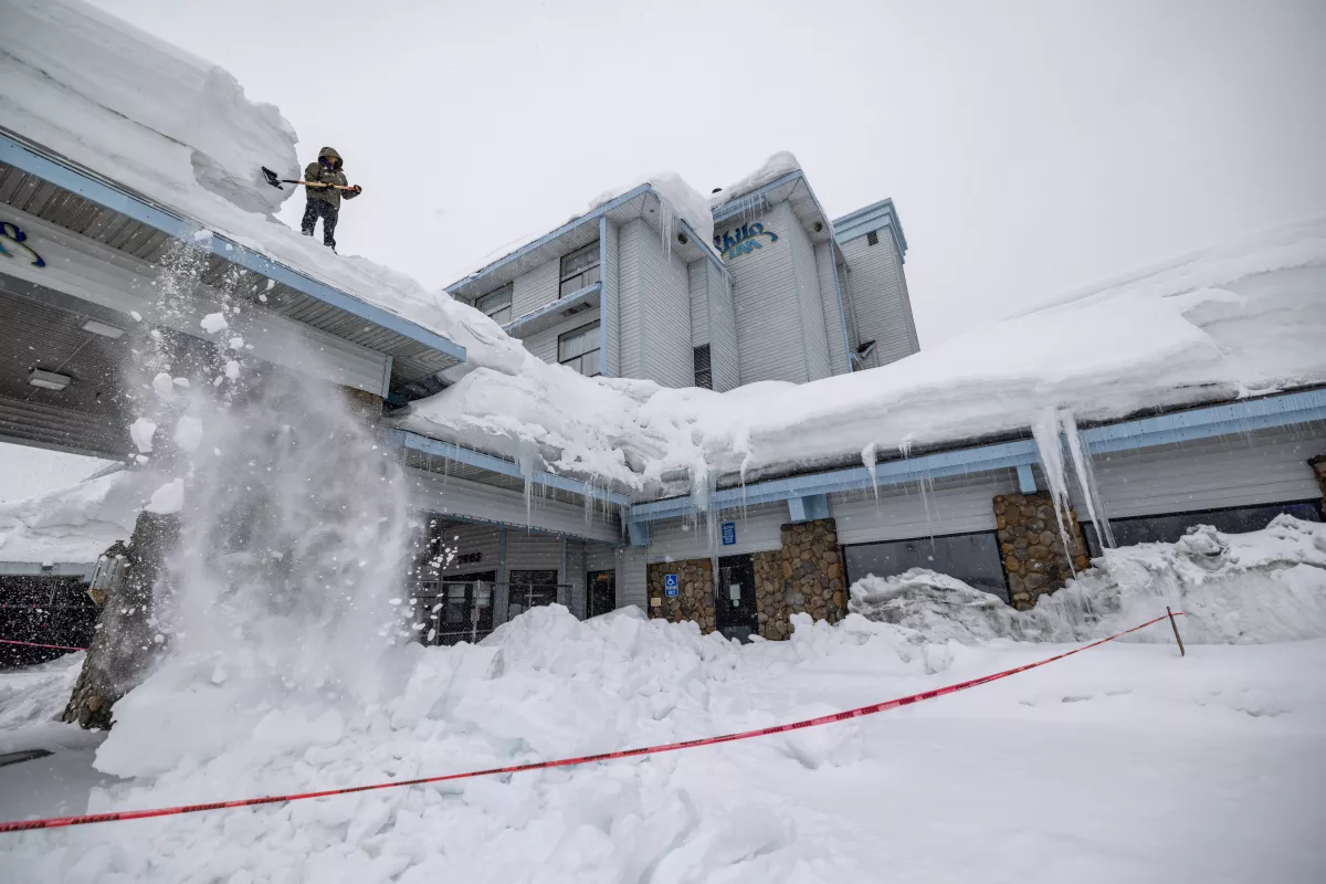 Photo: A worker shovels snow from a roof at the Shilo Inn as it continues to deepen in the first days of spring in Mammoth Lakes on March 21. (David McNew / Getty Images)
