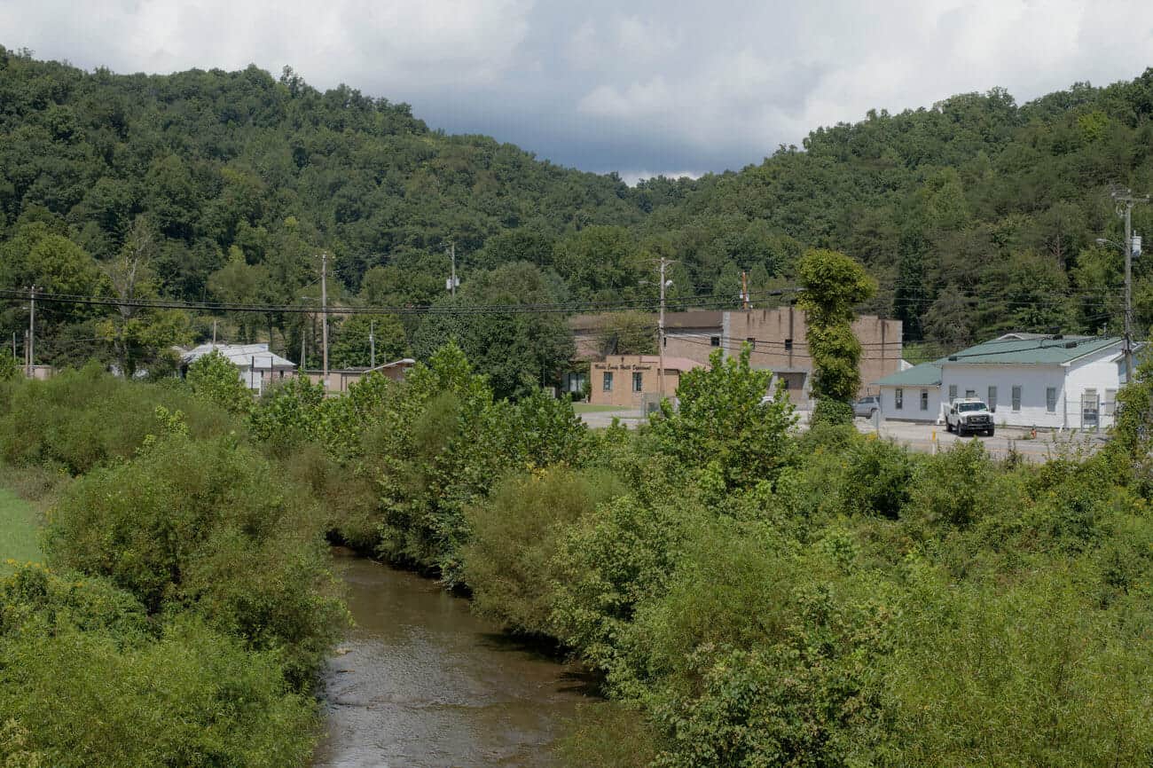 Rockcastle Creek flows past residential homes and businesses along Route 3 in the town of Inez, the county seat of Martin County, Ky. A giant coal sludge spill in October 2000 contaminated the county’s rivers for miles, and locals still don’t trust the water. Rich-Joseph Facun for NPR